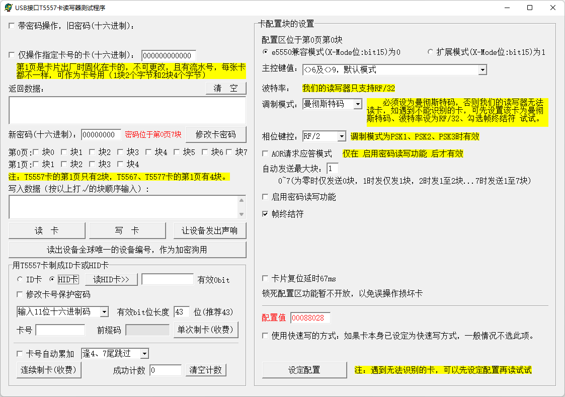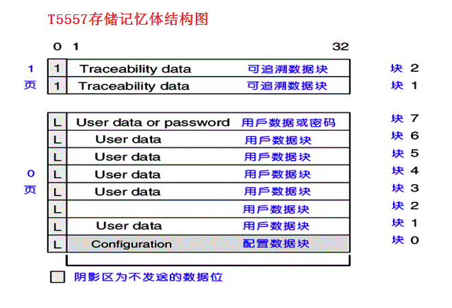 T5557卡是美国Atmel公司生产的多功能非接触式射频卡芯片,属于125KHz的低频卡,在国内仍然有广大的应用市场。该芯片共有330bit(比特)的EPROM(分布为10个区块, 每个区块33bit)。0页的块0是被保留用于设置T5557操作模式的参数配置块。第0页第7块可以作用户数据块使用,也可以作为保护全部数据的密码(假如在配置块中启用密码功能的话),防止非法改写数据。 第1页的1、2块保存了出厂商信息及唯一出厂ID,只能读取不可更改,我们的读写器取出其中的6个字节做为物理卡号,以实现与13.56等高频卡相同的应用场景。 T5567、T5577是T5557的升级版。