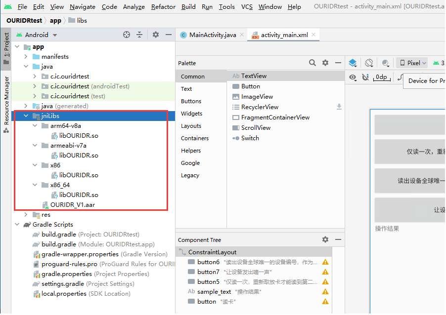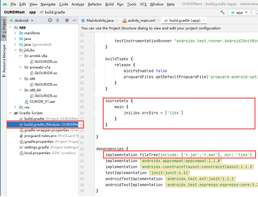 1、将我们提供的开发包里的文件夹libs及OURIDR_V1.aar,一起复制你的项目APP-->libs目录下;