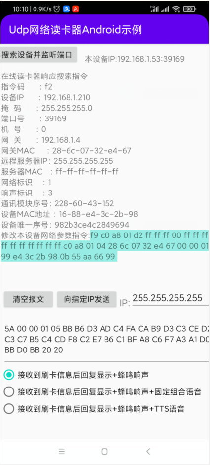 public void SetNetworkPara(byte[] indata){ //根据设备上传的信息生成修改网络参数指令 try {byte[] SendBuf1 = new byte [42]; SendBuf1[0]=(byte)0xF9; SendBuf1[1]=indata[1]; //读卡器ip,如需修改设正确值 SendBuf1[2]=indata[2]; SendBuf1[3]=indata[3]; SendBuf1[4]=indata[4]; SendBuf1[5]=indata[5]; //读卡器子网掩码,如需修改设正确值 SendBuf1[6]=indata[6]; SendBuf1[7]=indata[7]; SendBuf1[8]=indata[8]; SendBuf1[9]=(byte)0xff; //indata[23]; //读卡器远程服务器IP,,255.255.255.255表示广播方式,如需修改设正确值 SendBuf1[10]=(byte)0xff; //indata[24]; SendBuf1[11]=(byte)0xff; //indata[25]; SendBuf1[12]=(byte)0xff; //indata[26]; SendBuf1[13]=indata[27]; //读卡器远程服务器IP MAC,取值FF-FF-FF-FF-FF-FF 表示自动搜索MAC SendBuf1[14]=indata[28]; SendBuf1[15]=indata[29]; SendBuf1[16]=indata[30]; SendBuf1[17]=indata[31]; SendBuf1[18]=indata[32]; SendBuf1[19]=indata[13]; //读卡器网关IP,如需修改设正确值 SendBuf1[20]=indata[14]; SendBuf1[21]=indata[15]; SendBuf1[22]=indata[16]; SendBuf1[23]=indata[17]; //读卡器网关MAC,取值FF-FF-FF-FF-FF-FF 表示自动搜索MAC SendBuf1[24]=indata[18]; SendBuf1[25]=indata[19]; SendBuf1[26]=indata[20]; SendBuf1[27]=indata[21]; SendBuf1[28]=indata[22]; SendBuf1[29]=indata[11]; //机号,如需修改设正确值 SendBuf1[30]=indata[12]; SendBuf1[31]=indata[9]; //通讯端口,如需修改设正确值 SendBuf1[32]=indata[10]; SendBuf1[33]=indata[35]; //机器序列号,每台机唯一,不可更改 SendBuf1[34]=indata[36]; SendBuf1[35]=indata[37]; SendBuf1[36]=indata[38]; byte Funcode; Funcode=1; //0 刷卡时不发声 1 刷卡时发声 Funcode=(byte)(Funcode+2); //+2 远程电脑MAC自动搜索 +4 网关MAC自动搜索 Funcode=(byte)(Funcode+8); //+8 DHCP自动获得IP地址 +0 指定IP Funcode=(byte)(Funcode+0); //+16 卡离开感应区发信息 +0 卡离开感应区不发信息 Funcode=(byte)(Funcode+32*0); //卡在感应区是否重发信息 *0不重发 *1隔1秒重发 *2隔2秒重发 *3隔5秒重发 *4隔10秒重发 SendBuf1[37]=Funcode; SendBuf1[38]=(byte)0x55; //4字节固定后缀 SendBuf1[39]=(byte)0xaa; SendBuf1[40]=(byte)0x66; SendBuf1[41]=(byte)0x99; String SendInfStr=""; for(int p=0;p<42;p++){ String bytestr="00"+Integer.toHexString(SendBuf1[p] & 0xff); SendInfStr=SendInfStr+ bytestr.substring(bytestr.length() -2,bytestr.length())+" "; } updatetrack("修改本设备网络参数指令:"+SendInfStr+"\n"); }catch (Exception e){ updatetrack(e.getMessage()+"\n\n"); } } public void DisableSendAge(byte[] indata,String RemIP,int RemPor){ //确定接收到信息 byte[] SendBuf1 = new byte [9]; SendBuf1[0]=(byte)0x69; String SendInfStr="69 "; for(int p=1;p<9;p++){ SendBuf1[p]=indata[p]; String bytestr="00"+Integer.toHexString(indata[p] & 0xff); SendInfStr=SendInfStr+ bytestr.substring(bytestr.length() -2,bytestr.length())+" "; } try { DatagramSocket s1 = new DatagramSocket(); DatagramPacket dp1 = new DatagramPacket(SendBuf1, SendBuf1.length, InetAddress.getByName(RemIP), RemPor); s1.send(dp1); s1.close(); updatetrack("SendTo:"+RemIP+" Data:"+SendInfStr+"\n\n"); }catch (Exception e){ updatetrack(e.getMessage()+"\n\n"); } } public void SendDispBeep(String CardNum,String RemIP,int RemPor){ //向设备发送显示文字及蜂鸣响声 try { String DispStr="卡号:"+CardNum+" "+GetSysDT().substring(2,19)+" "; //将显示的文字生成字节数组 byte[] DispBuf= DispStr.getBytes("gb2312"); byte[] SendBuf1 = new byte [39]; /** 2、将要发送的数据打包 */ SendBuf1[0]=(byte)0x5a; //指令码 SendBuf1[1]=(byte)0x00; //机号低 SendBuf1[2]=(byte)0x00; //机号高 SendBuf1[3]=(byte)0x02; //蜂鸣声代码 SendBuf1[4]=(byte)0x14; //显示时长 for(int i=0;i<34;i++){ //显示文字 SendBuf1[i+5]=DispBuf[i]; } String SendInfStr=""; for(int p=0;p<39;p++){ String bytestr="00"+Integer.toHexString(SendBuf1[p] & 0xff); SendInfStr=SendInfStr+ bytestr.substring(bytestr.length() -2,bytestr.length())+" "; } DatagramSocket s1 = new DatagramSocket(); DatagramPacket dp1 = new DatagramPacket(SendBuf1, SendBuf1.length, InetAddress.getByName(RemIP), RemPor); Recsock.send(dp1); s1.close(); updatetrack("SendTo:"+RemIP+" Data:"+SendInfStr+"\n\n"); }catch (Exception e){ updatetrack(e.getMessage()+"\n\n"); } } public void SendDispSpk(String CardNum,String RemIP,int RemPor) { //向读卡器发送显示文字及固定组合语音 try { String DispStr="卡号:"+CardNum+" "+GetSysDT().substring(2,19)+" "; //将显示的文字生成字节数组 byte[] DispBuf= DispStr.getBytes("gb2312"); byte SpkLen=3; //固定组合语音长度,一次最大取值21条 byte[] SpkBuf=new byte[SpkLen]; //固定组合语音代码缓冲, SpkBuf[0]=55; //要播报的语音代码0 SpkBuf[1]=41; //要播报的语音代码1 SpkBuf[2]=53; //要播报的语音代码2...... byte[] SendBuf1 = new byte [70]; /** 2、将要发送的数据打包 */ SendBuf1[0]=(byte)0x5B; //指令码 SendBuf1[1]=(byte)0x00; //机号低 SendBuf1[2]=(byte)0x00; //机号高,如果高低位都为0表示任意机号 SendBuf1[3]=(byte)0x02; //蜂鸣声代码,取值范围参看通讯协议 SendBuf1[4]=(byte)0xF0; //继电器代码 F0表示全部继电器 F1表示1号继电器 F2表示2号继电器 SendBuf1[5]=(byte)0x20; //继电器开启时长 低位 SendBuf1[6]=(byte)0x00; //继电器开启时长 高位 SendBuf1[7]=(byte)0x14; //显示保留时间,单位为秒,为0xFF时表示永久显示 SendBuf1[8]=(byte)0x00; //在显示屏中的哪个位置开始,一般取0表示首位 SendBuf1[9]=36; //显示字符串长度 为全屏显示为 36 个字符 SendBuf1[10]=SpkLen; //语音长度 for(int i=0;i<34;i++){ //要显示的文字 SendBuf1[11+i]=DispBuf[i]; } for(int i=0;i<SpkLen;i++){ //要播报的固定语音代码 SendBuf1[47+i]=SpkBuf[i]; } SendBuf1[47+SpkLen+0]=(byte)0x55; //固定的抗干扰后缀 SendBuf1[47+SpkLen+1]=(byte)0xaa; SendBuf1[47+SpkLen+2]=(byte)0x66; SendBuf1[47+SpkLen+3]=(byte)0x99; String SendInfStr=""; for(int p=0;p<=47+SpkLen+3;p++){ String bytestr="00"+In