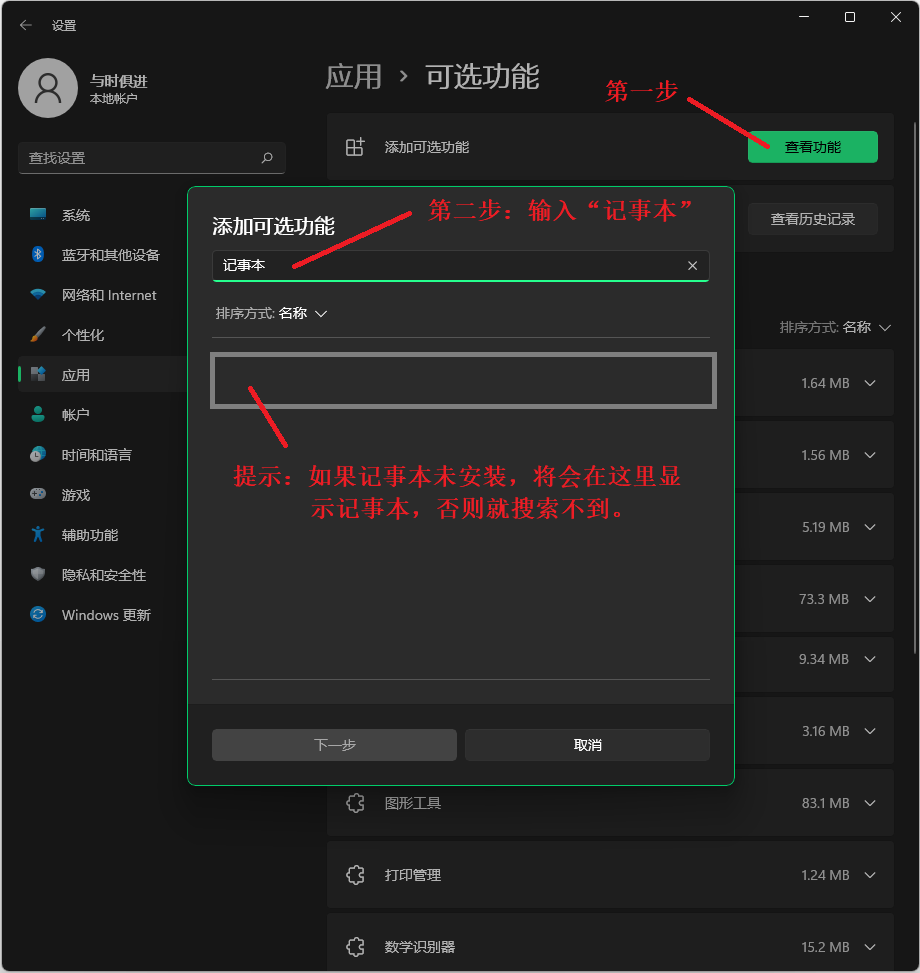 打开电脑设置 --> 应用 --> 可选功能 > 点【添加可选功能】右边的查看功能 --> 搜索记事本