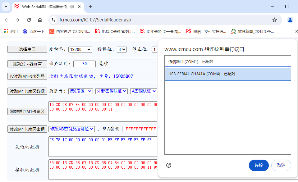 出于信息安全的原因,以往浏览器是无法直接控制电脑上的设备的,所以,很多黑客为了控制其他电脑,一般就是做一段木马程序,通过各种办法引诱上网小白们通过浏览器下载安装一堆堆的垃圾软件,其中很有可能就有一段木马病毒通过这种方式植入到了电脑。中了木马病毒的设备就象一只待宰的羔羊,黑客们可以通过木马病毒控制电脑,偷取电脑内的数据、破坏电脑系统。在这种情况下,浏览器做为上网的窗口,如果它可以直接控制电脑上的设备是一件很有安全隐患的事情。 然而,随着互联网的发展,以B/S结构开发程序越来越占主流,B/S结构的软件都通过浏览器与操作人员交互数据,这又使得通过浏览器来控制本电脑的设备变得越来越有需求。 你看,这是不是非常矛盾的一种状态? 但是,需求一定是占主导地位的,需求推动整个世界的前进,所以,通过许多大神的辛勤、努力,开发了一些由浏览器控制电脑设备的工具,Web Serial Api就是其中的一个,它可以通过浏览器直接向电脑上的串口设备发送指令,从而控制通过串口连接的电脑外设。Microsoft Edge、Google Chrome、360等主流浏览器都以全面支持Web Serial Api。 出于安全考虑,浏览器连接串口前,都会跳出提示窗口让使用者确认授权连接指定的串口。 以下Javascript代码展示了通过 Web Serial Api ,浏览器打开指定串口,向串口发送读、写M1卡的指令完成读写M1卡操作。