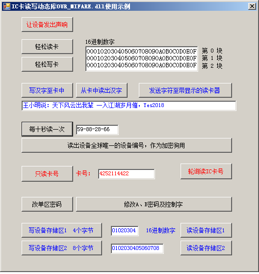 显示函数简单说明: 只需将接口函数动态库放OUR_MIFARE.dll及ICUSB.DLL放在应用程序相同的目录。这两个动态库是开发部用VC6.0编译生成的。 发送字符至读写器液显的函数: 原型:unsigned char __stdcall lcddispfull(LPSTR lcdstr)。 如lcddispfull("我是中国人!")。