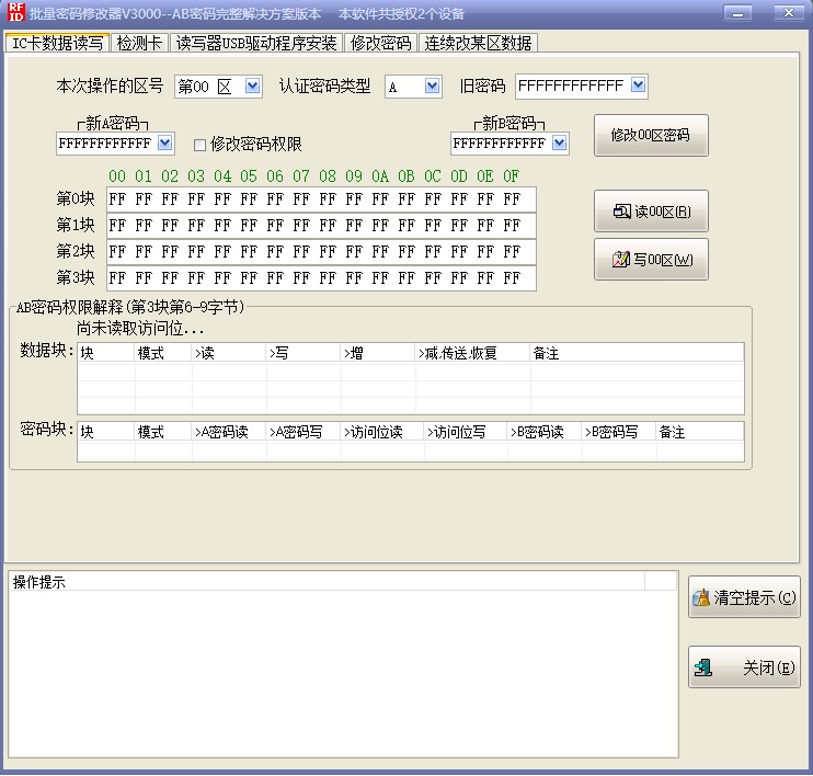 支持客户AB密码方案,如有些客户需要“用B密码来改A密码,而A密码不能自己A密码,A密码只有用来读、写、增、减数据块第0、1、2块”的功能,这时就需要下载以下开发包,仔细研读说明文档关于piccchangesinglekeyex函数的操作。正确的AB密码权限访问字编码可用用我们的测试程序取出,测试程序图片请看下图: