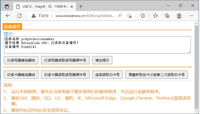 网页测试:http://www.bossknow.cn:90/RongShiWebReaderTest/IDReaderDemo.html