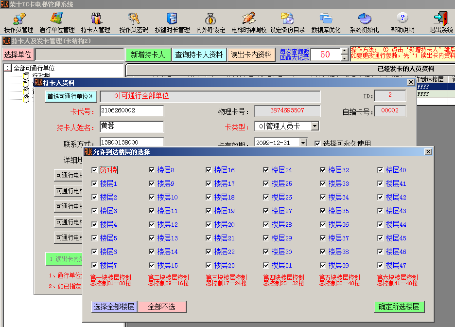 用户卡信息包括两个时间段定义、两个时间段对应的楼层标志、剩余使用次数、有效期限。刷卡时读卡器会根据用户卡信息进行核对,核对信息正确时输出相关信息到开关控制板,开关控制板接收后,将开启楼层相应的继电器。电梯管理人员可根据此继电器的开关信息,通过不同的接线方法,产生各种各样的用户操作模式。比如:模式一,用户先刷卡,在五秒内按自己的楼层按钮才有效,五秒后无效。不先刷卡也无效。模式二,刷卡直接上自己的楼层,不需要再按楼层按钮。别外,如果需要刷卡才能打开电梯门功能,只需在一楼电梯口安装一个读卡器和开关板控制一楼的按钮即可。