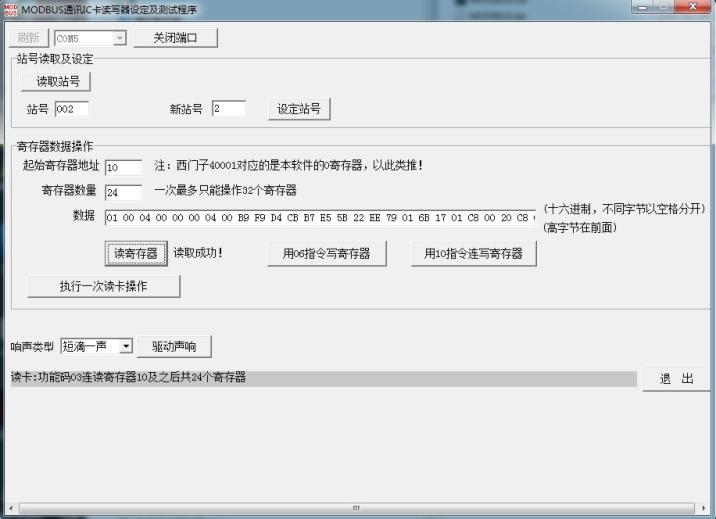06、40003寄存器:用06功能码写值驱动读卡器响声;