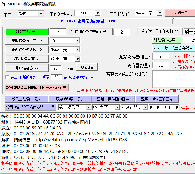 MODBUS-485扇区读写,读身份证UID,外接扫码IC-10MRWU
