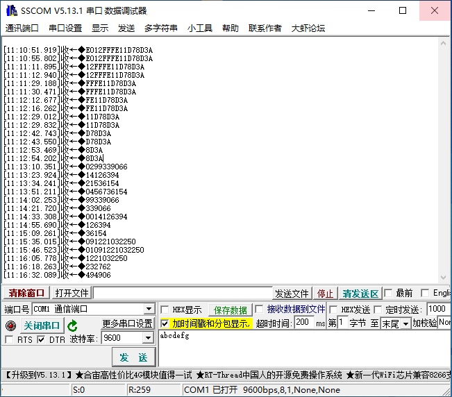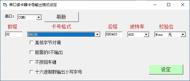 同一卡设置成不同输出格式,串口助手读取的卡号: