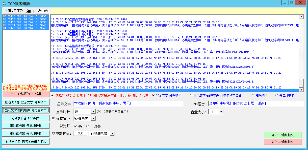 02、设备主动读卡成功后向远程服务器端口发送机号、卡号等信息,服务器只需监听端口数据包就可以实时获取到刷卡信息,并可以驱动读卡器不同的响声及显示文字;
