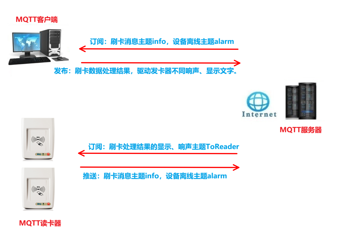 02、设备主动读卡并将卡号、机号等信息推送到MQTT服务器,服务器接收到读卡信息后将读卡数据分发给已订阅刷卡主题的客户端;