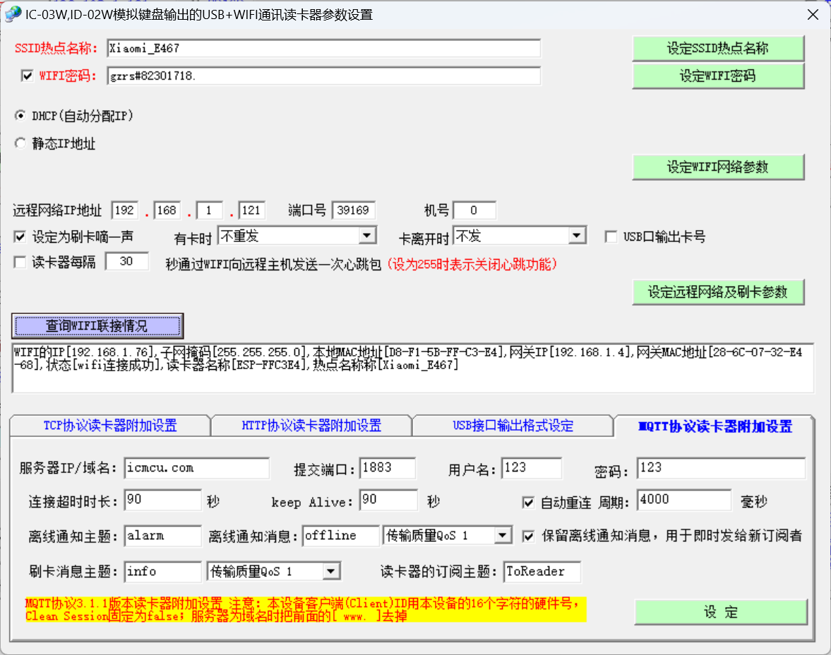 MQTT读卡器网络参数设置